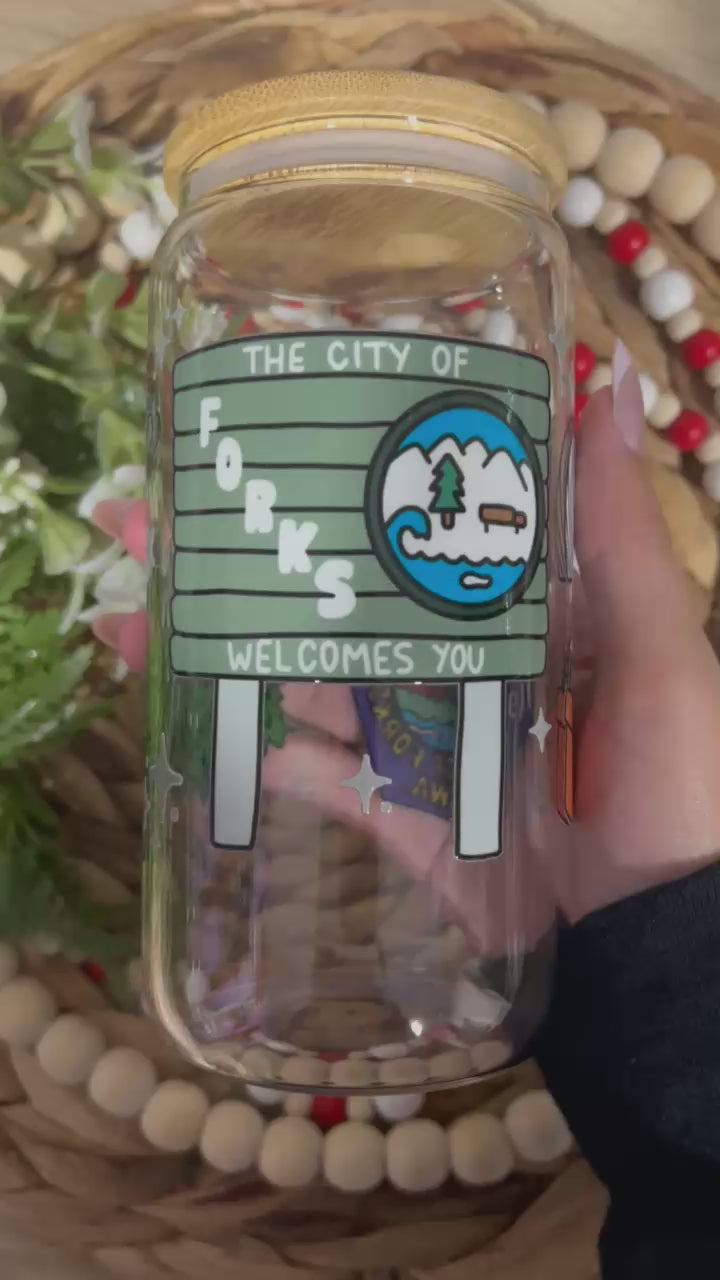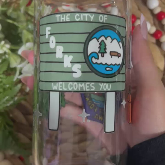 Bring the misty charm of Forks, Washington to your drinkware collection with these Twilight-inspired glass cups. Designed with atmospheric artwork that captures the rainy forests, small-town mood, and iconic aesthetic of the setting, each cup offers a unique take on the beloved location. With two different versions to choose from, you can pick the style that matches your vibe—or collect them both.