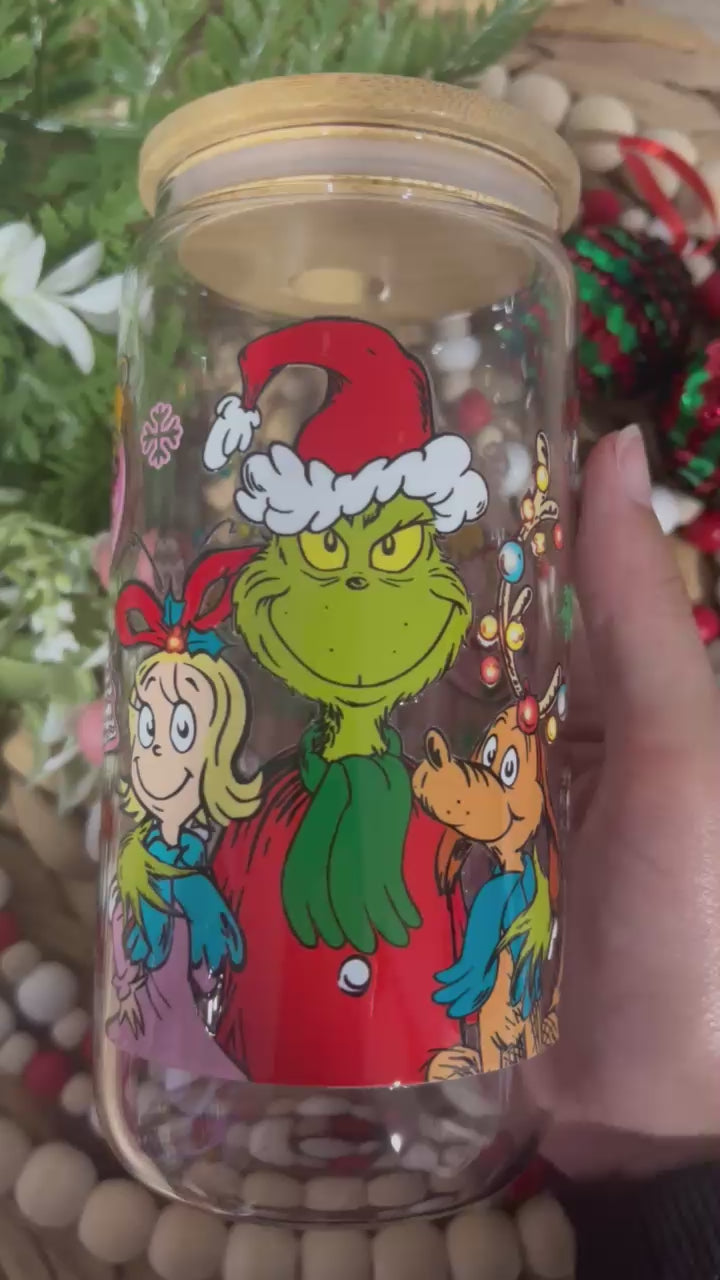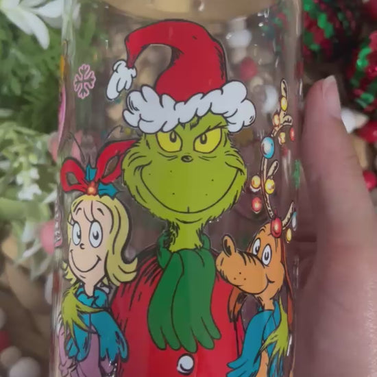 Bring a festive pop of pink to your holiday season with our Grinch Christmas Pink Themed Glass Cup from Glass & Glamour Co. This cheerful cup features playful, holiday-inspired illustrations inspired by a certain grumpy green character, a sweet little girl with big Christmas spirit, and a loyal pup — all surrounded by soft pink accents for a fun and cozy twist on a classic holiday favorite.