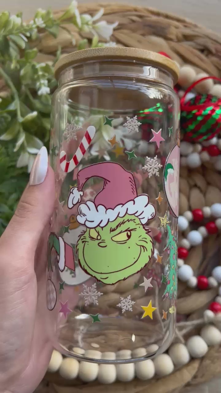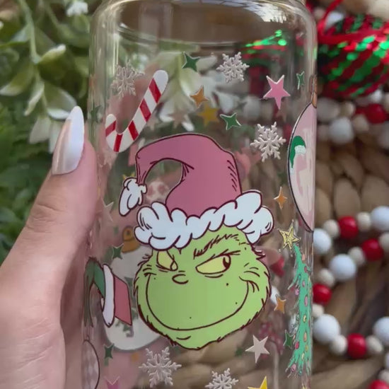 Get into the mischievous spirit of the season with our Holiday Green Grouch Inspired Glass Cup from Glass & Glamour Co. This playful design features a grumpy green holiday face paired with a loyal pup, surrounded by snowflakes and Christmas trees for the perfect touch of winter cheer and humor. It’s a fun nod to a classic holiday tale—reimagined in an original, festive way.