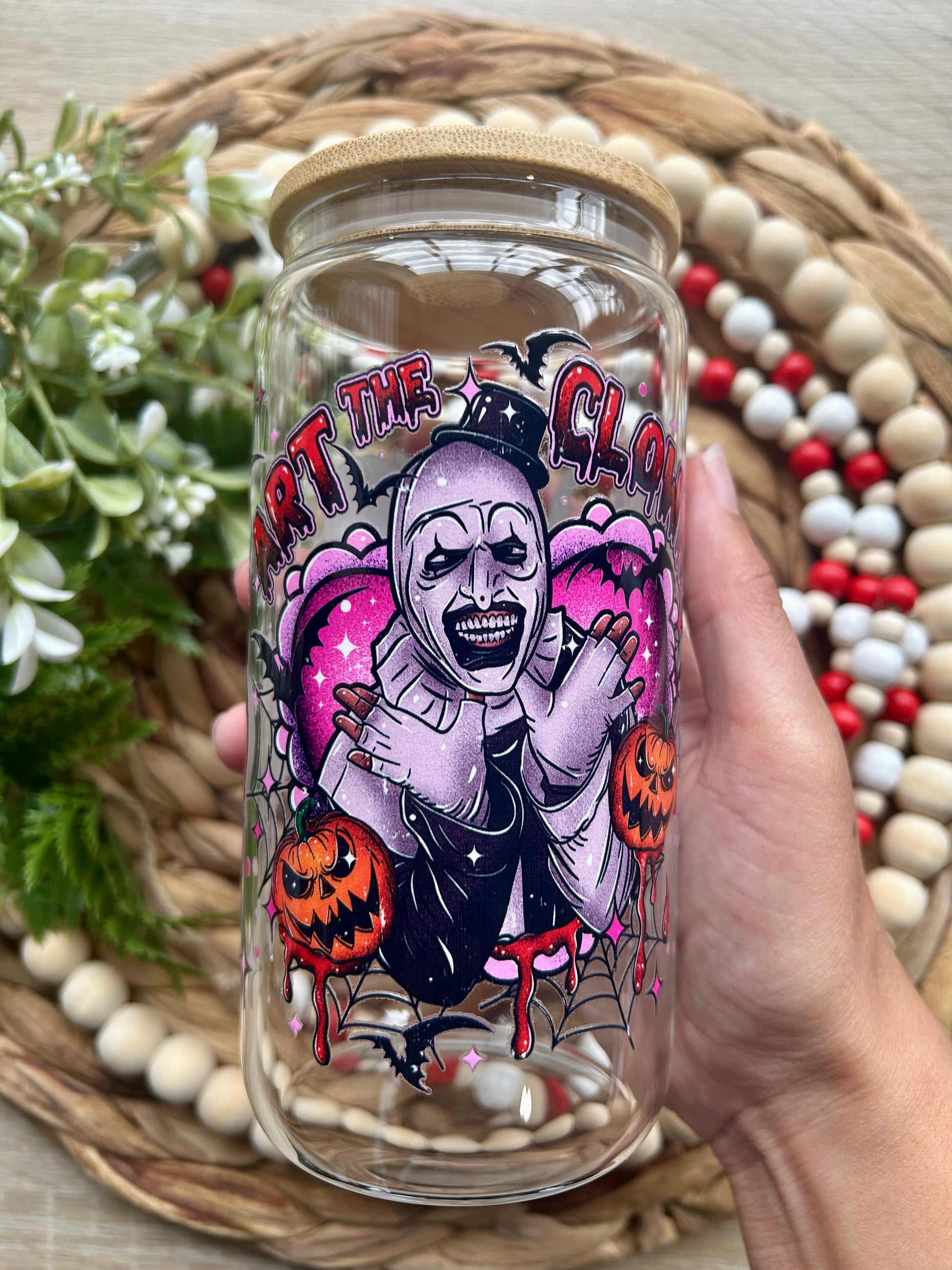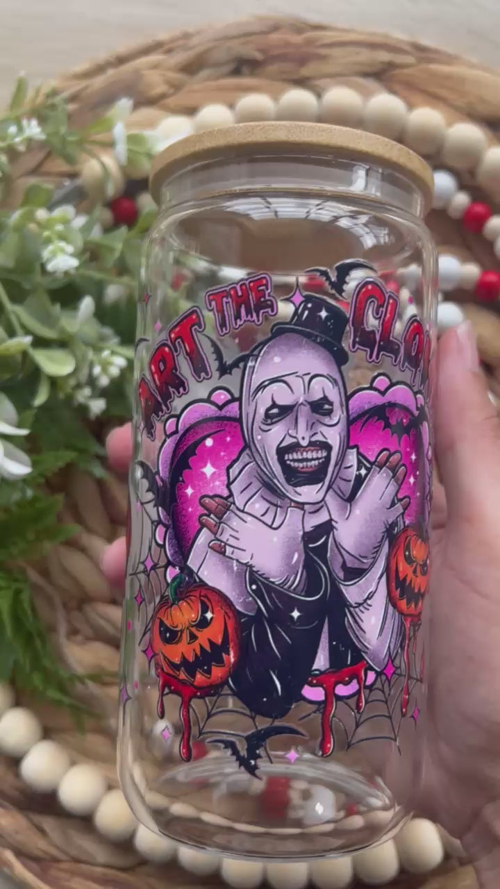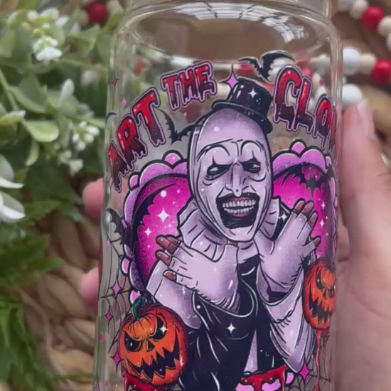 Add a truly chilling touch to your drinkware collection with our Sinister Clown & Pumpkins Inspired Glass Cup from Glass & Glamour Co. This design features an eerie, black-and-white clown illustration surrounded by haunting pumpkins—perfect for fans of modern horror and those who love a bold, unsettling aesthetic.